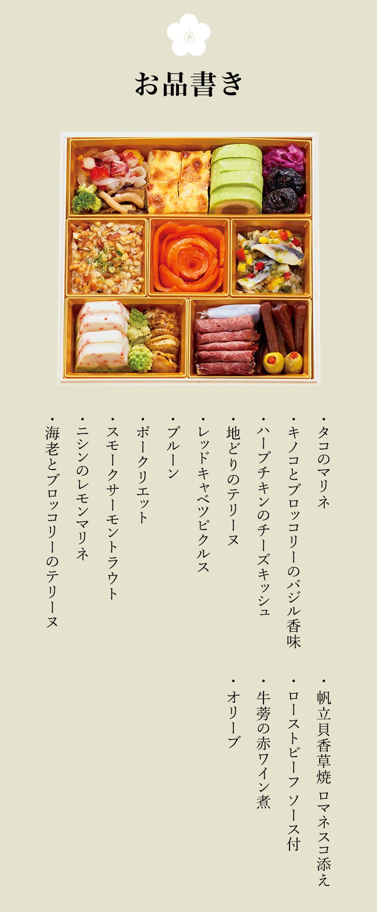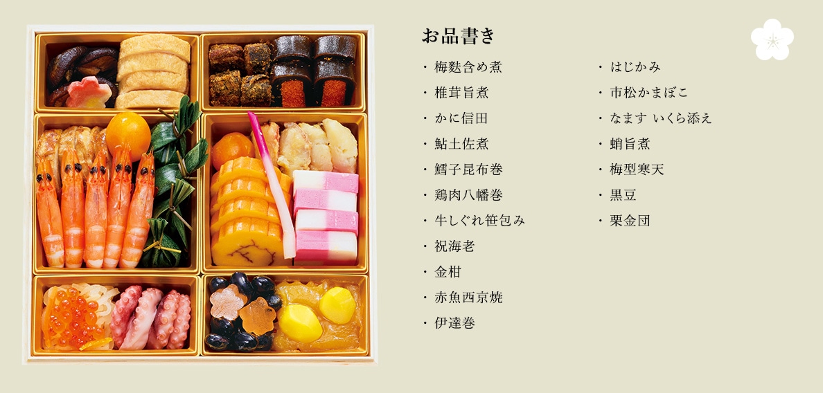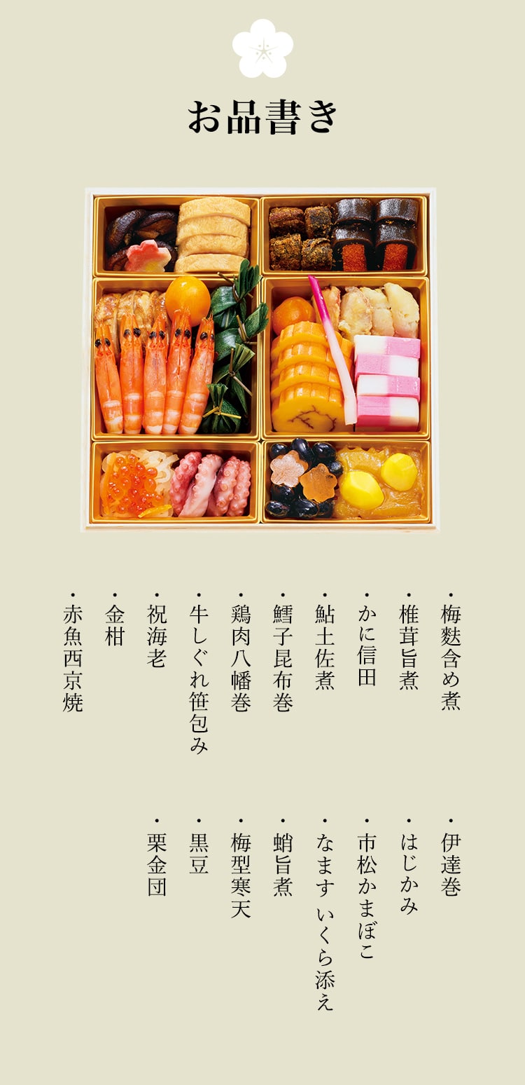 原材料 おせちと一緒にお届けする一括表記に明記しています。原材料の詳細については、カスタマーサポートまでお問合せください。 |
