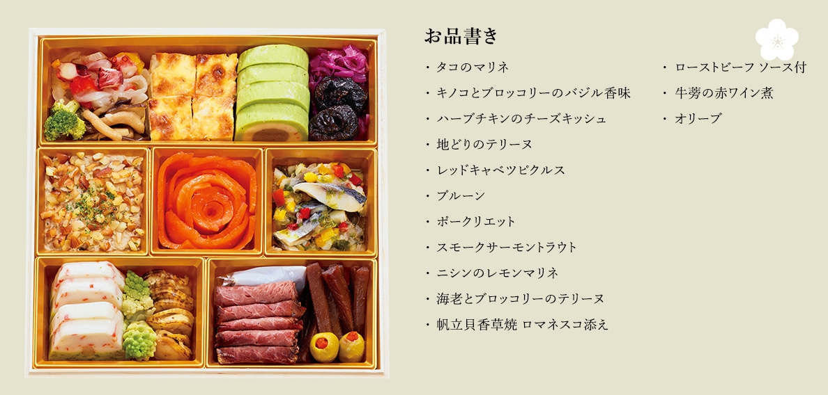 祝いの席を彩る縁起物を中心に、伝統の技で丁寧に仕立てた和の美味が揃います。伊達巻や栗金団、黒豆などおせち定番に加え、赤魚西京焼や鮎土佐煮、鶏肉八幡巻など、ホテル監修ならではの上質な味わいを贅沢に詰め合わせました。