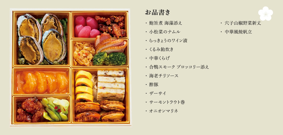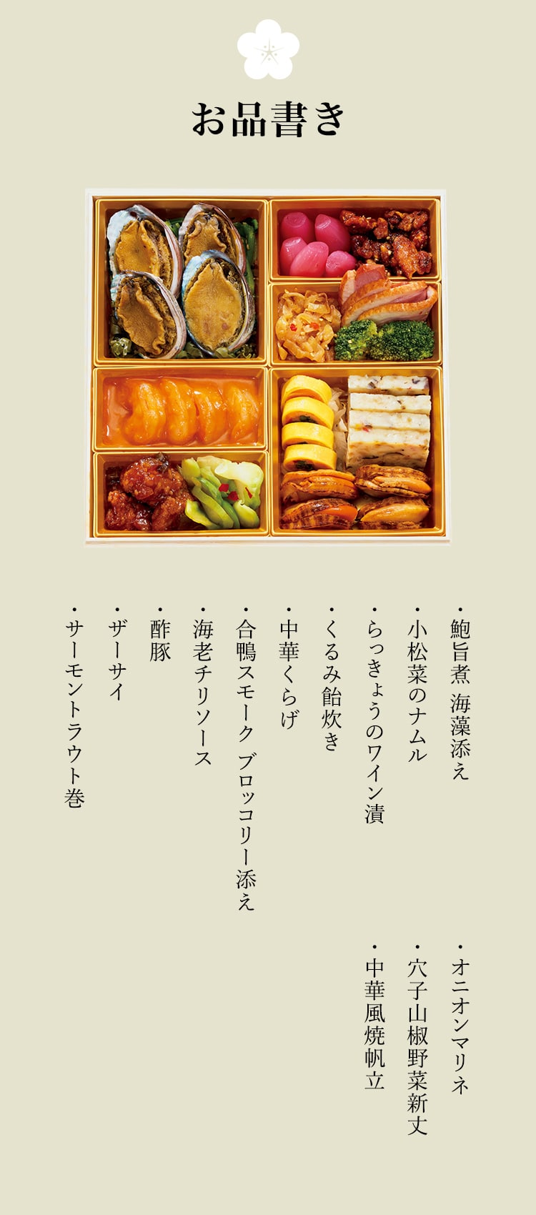 本格中華を豊富に盛り込んだ一段。料理長直伝の海老チリソースをはじめ、酢豚やザーサイ、合鴨スモークなど香り高い中華料理が満載。鮑の旨煮や中華くらげも加わり、濃厚な旨みと多彩な食感が食卓に新たな彩りを添えます。