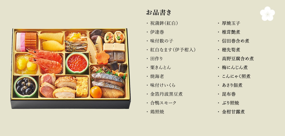 原材料 おせちと一緒にお届けする一括表記に明記しています。原材料の詳細については、カスタマーサポートまでお問合せください。 |