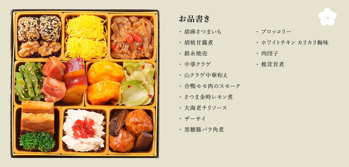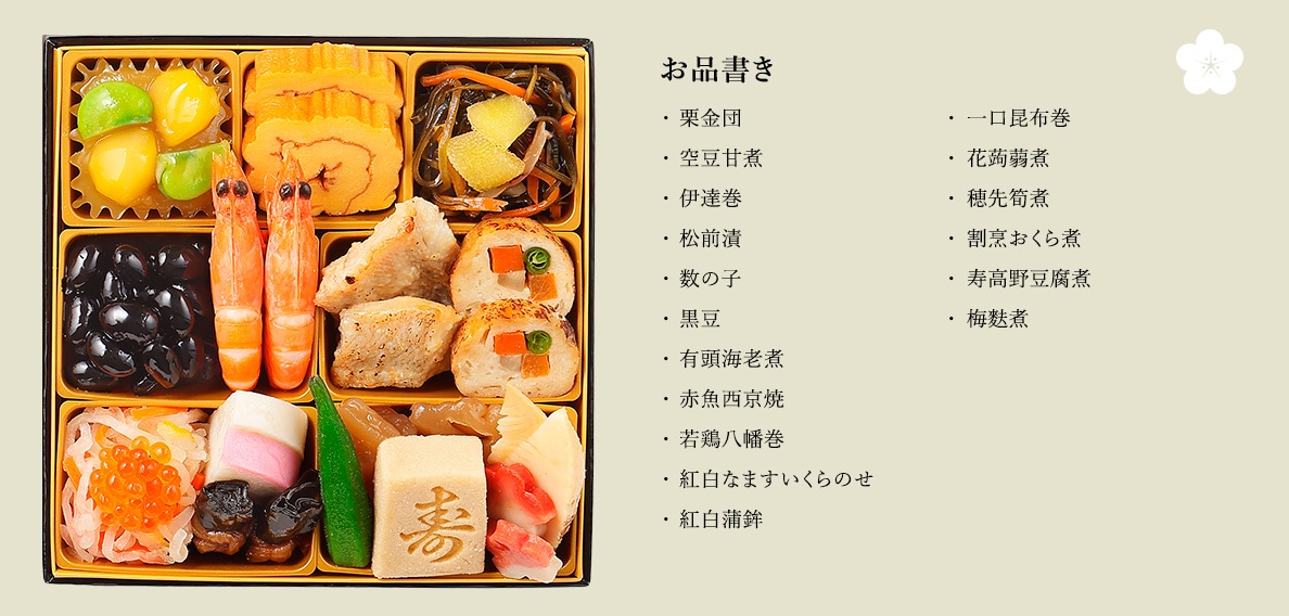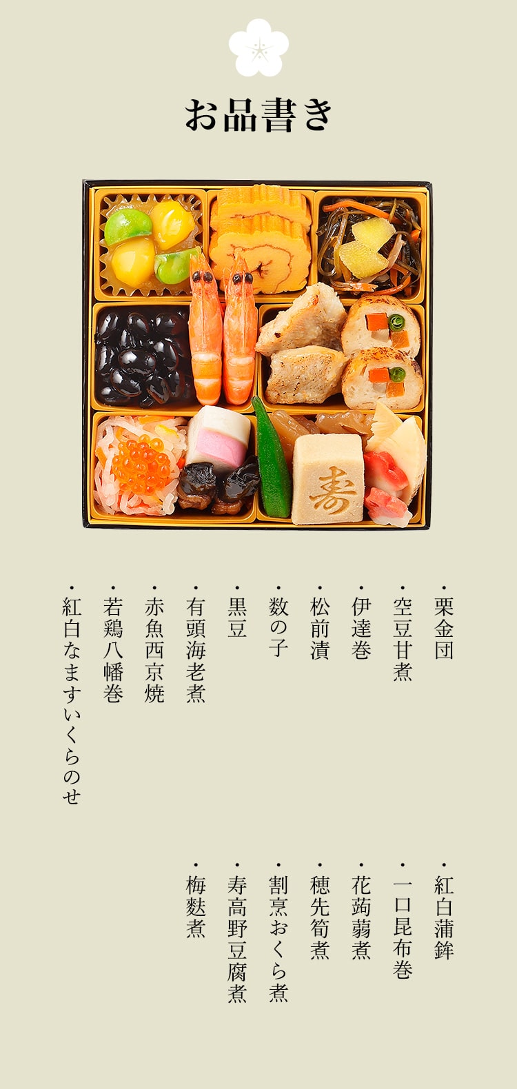 原材料 おせちと一緒にお届けするリーフレット(お品書き)に明記しています。原材料の詳細については、カスタマーサポートまでお問合せください。 |