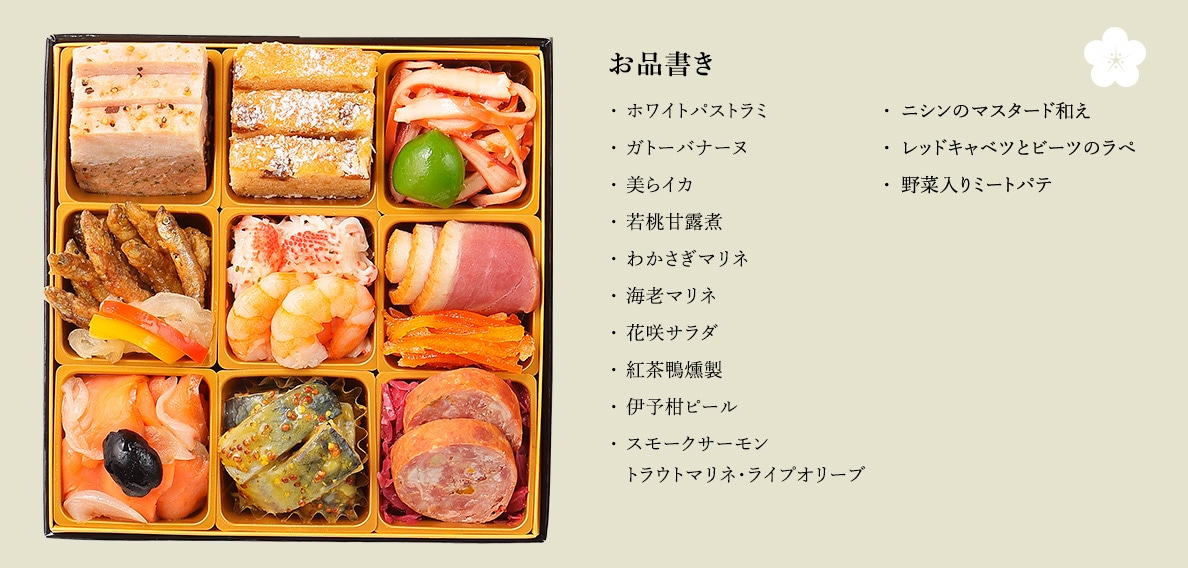 二の重は洋風おせちです。鶏むね肉を使用したあっさりとした味わいの上部と、青さのりをちりばめた練生地の下部でふたつの食感を楽しめる人気の「ホワイトパストラミ」や「紅茶鴨燻製」、「スモークサーモントラウトマリネ」を盛リ付け、デザートにはフランス菓子の「ガトーバナーヌ」をご用意しました。