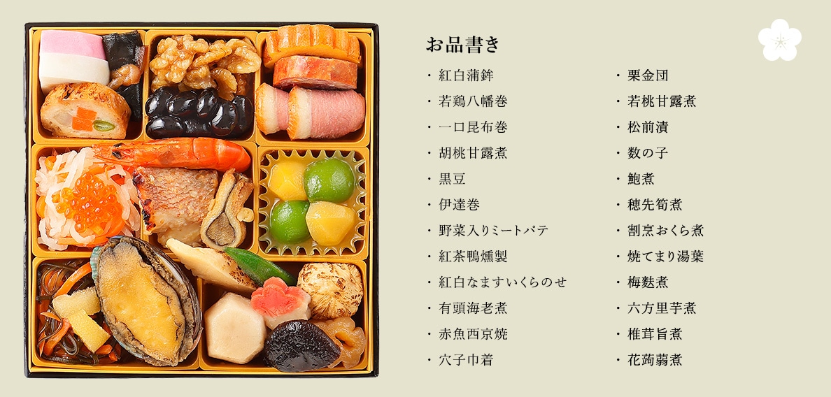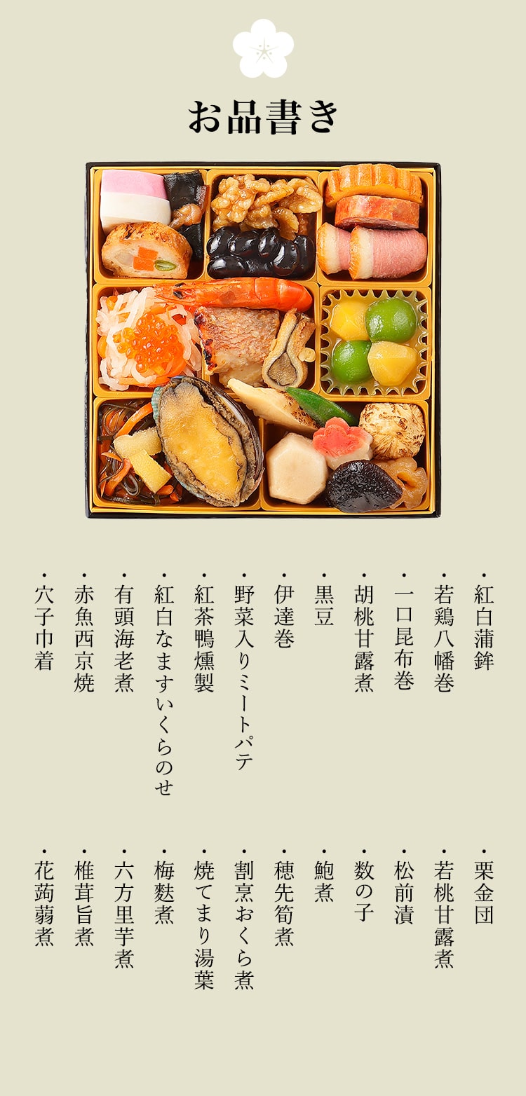 原材料 おせちと一緒にお届けするリーフレット(お品書き)に明記しています。原材料の詳細については、カスタマーサポートまでお問合せください。 |