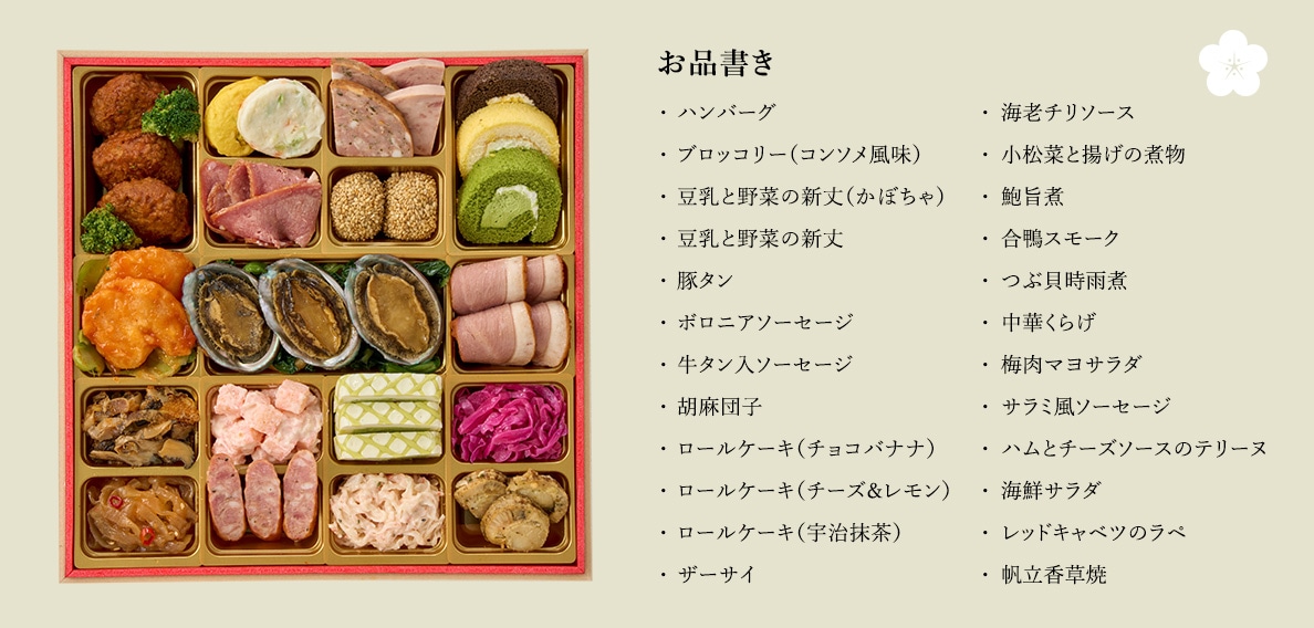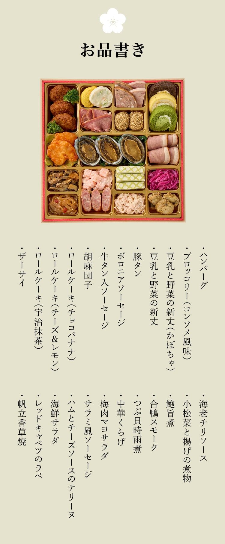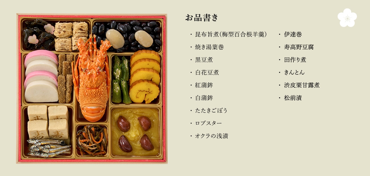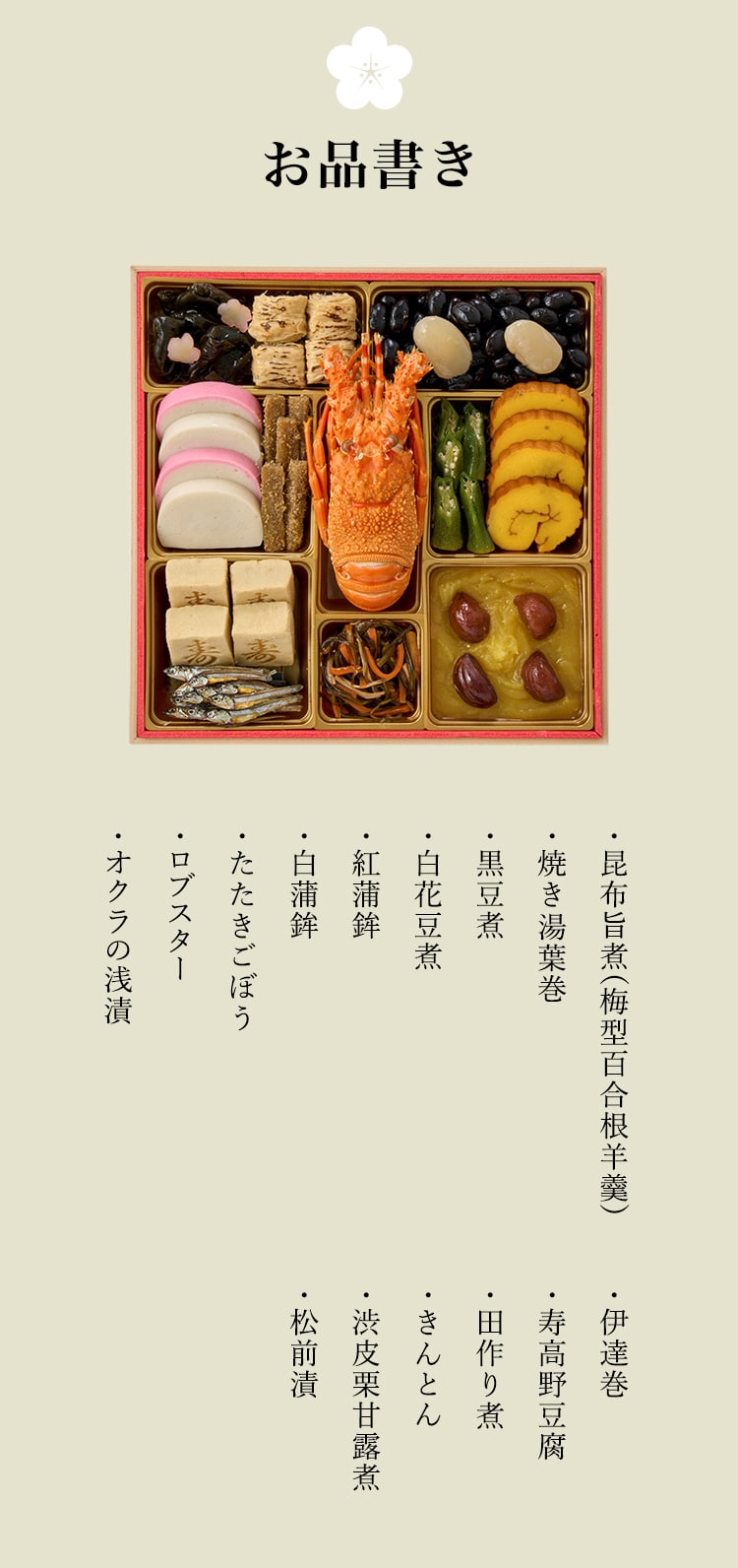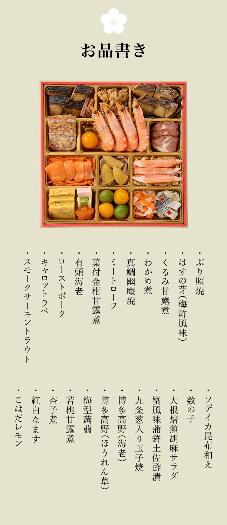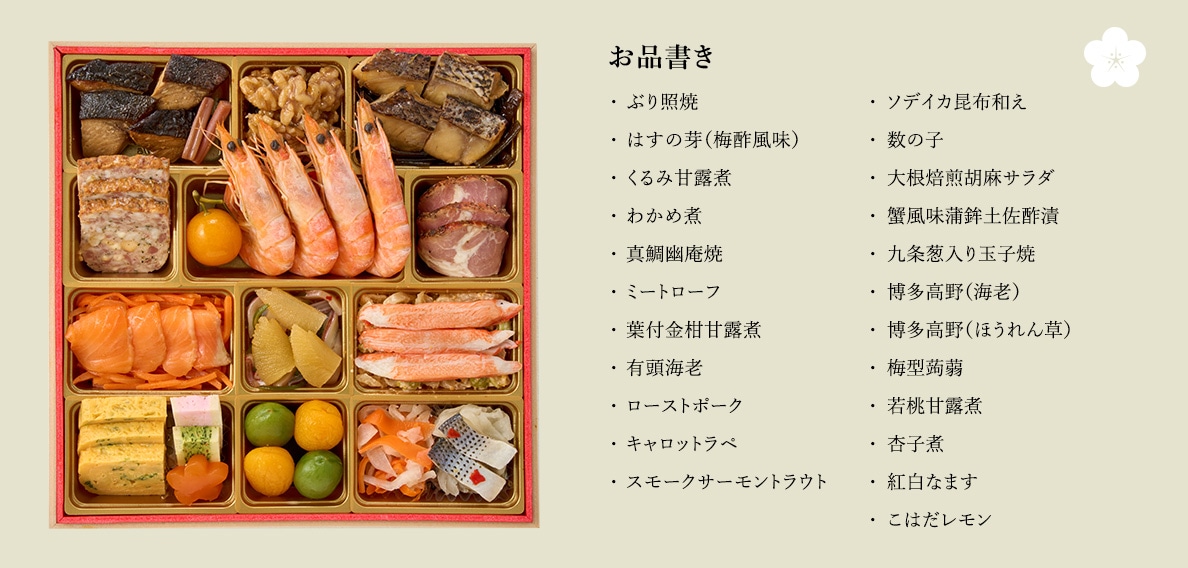 原材料 おせちと一緒にお届けするリーフレット(お品書き)に明記しています。原材料の詳細については、カスタマーサポートまでお問合せください。 |