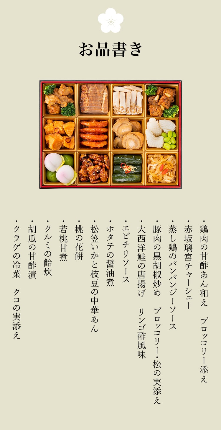 - 高級広東料理の名店『赤坂璃宮』監修のおせちです。