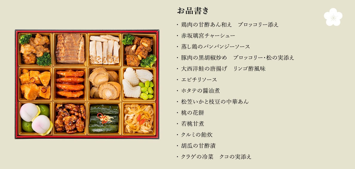 - 優しい味わいが特徴の豪華中華おせちをお楽しみください。