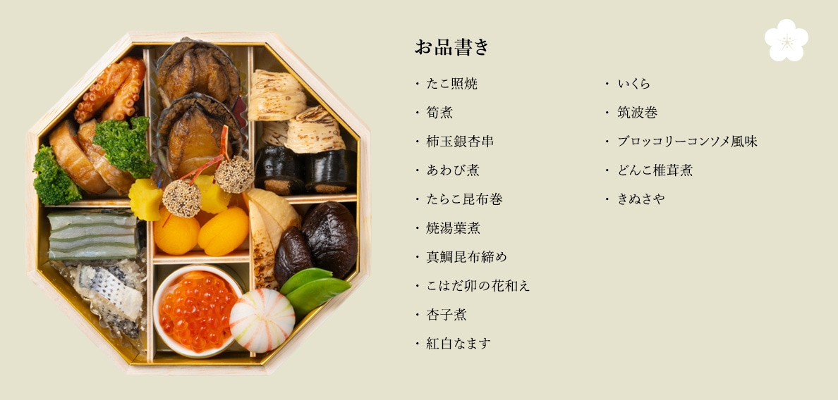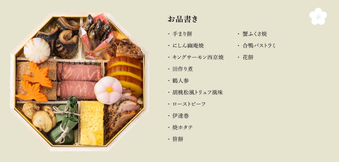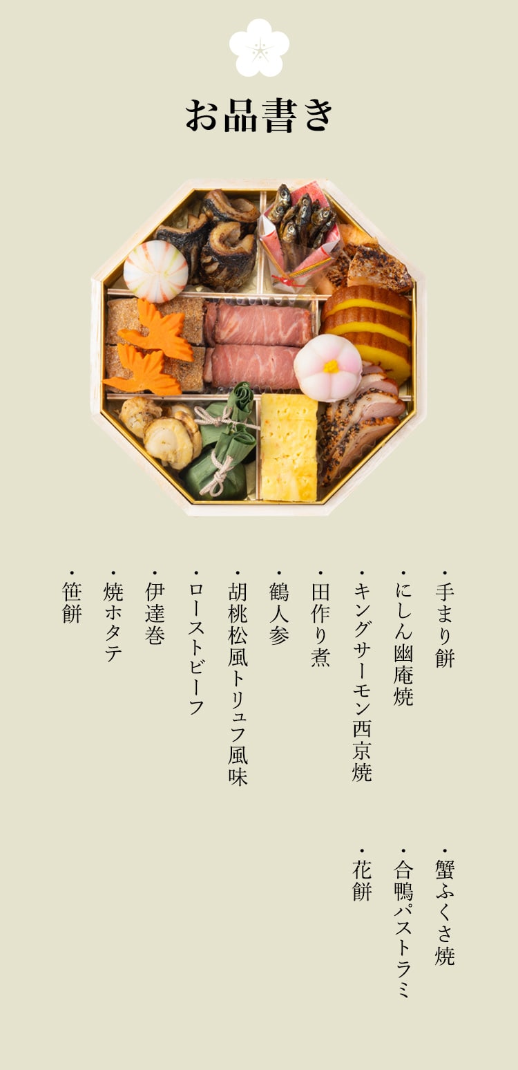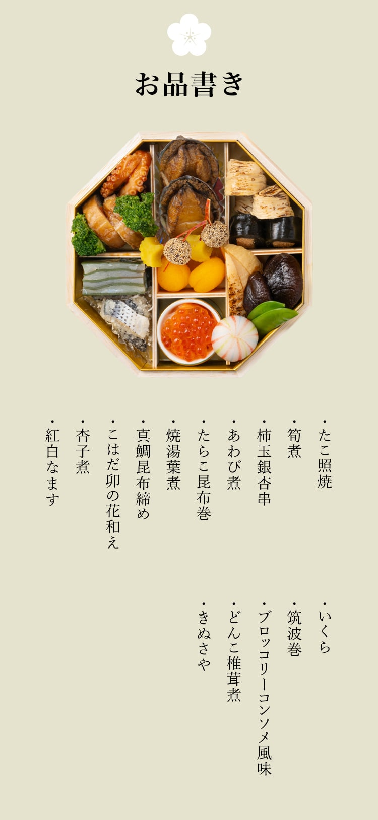 原材料 おせちと一緒にお届けするリーフレット(お品書き)に明記しています。原材料の詳細については、カスタマーサポートまでお問合せください。 |