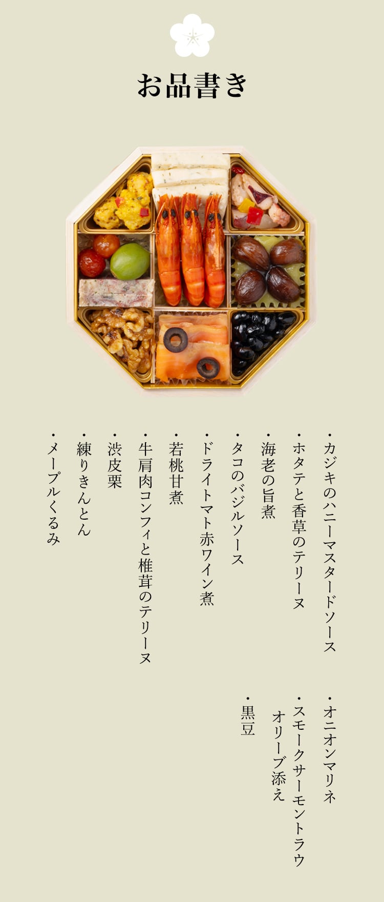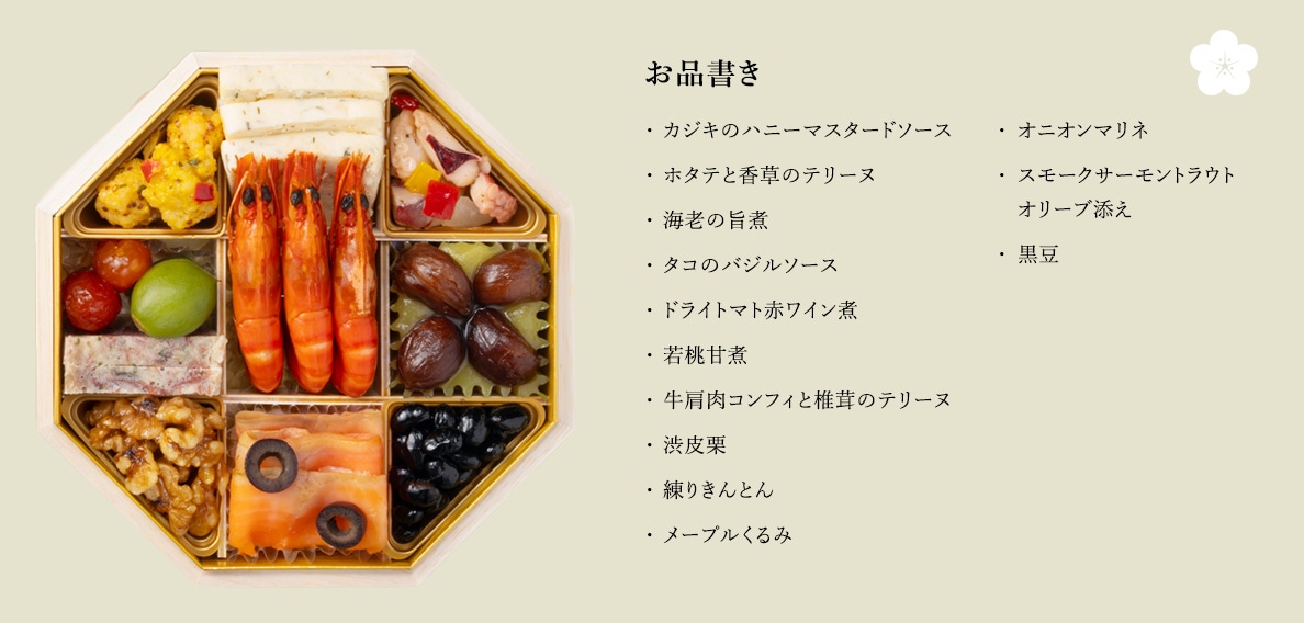 - 老舗ホテルならではの気品ある洋の味わいと、日本の伝統的なおせち料理が絶妙に調和した贅沢な一品です。