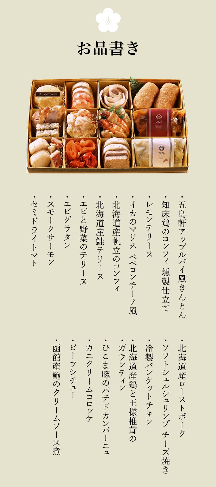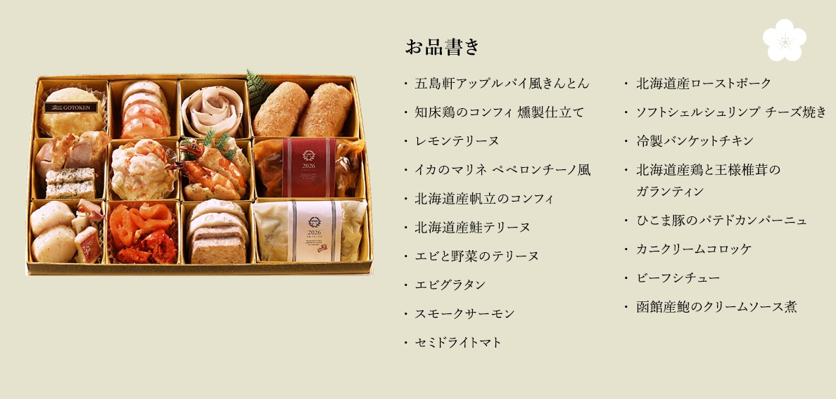 - 創業明治12年、函館の老舗「五島軒」より、伝統の洋食を詰め込んだ華やかなオードブルセットをお届けします。