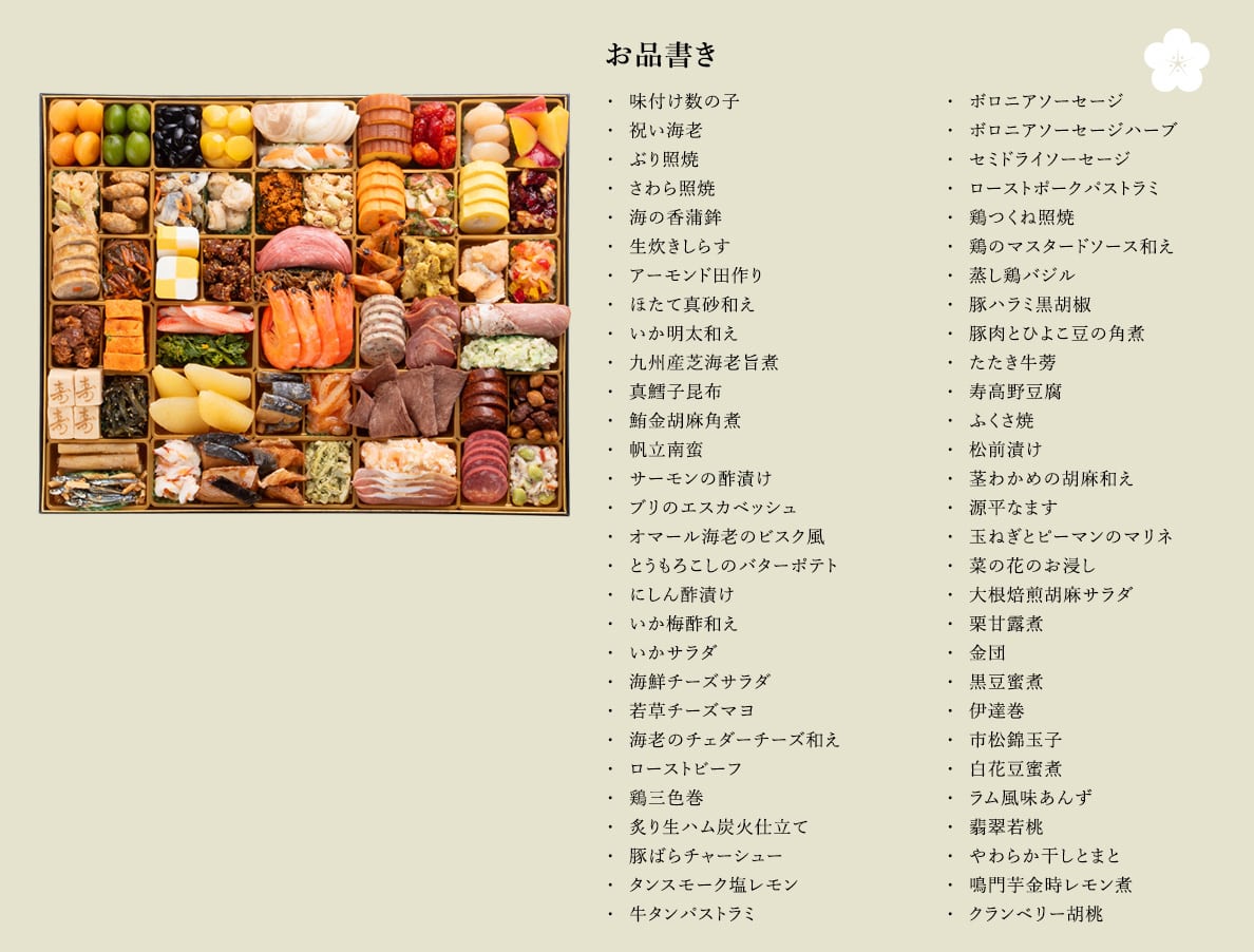 原材料 おせちと一緒にお届けするリーフレット(お品書き)に明記しています。原材料の詳細については、カスタマーサポートまでお問合せください。 |