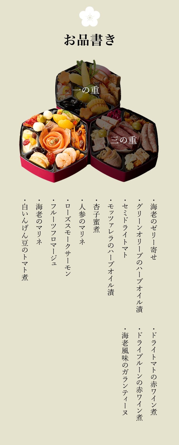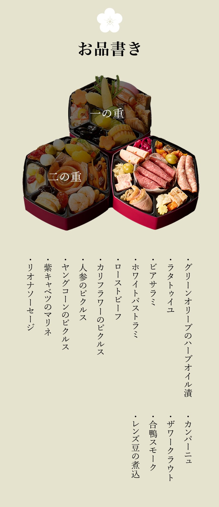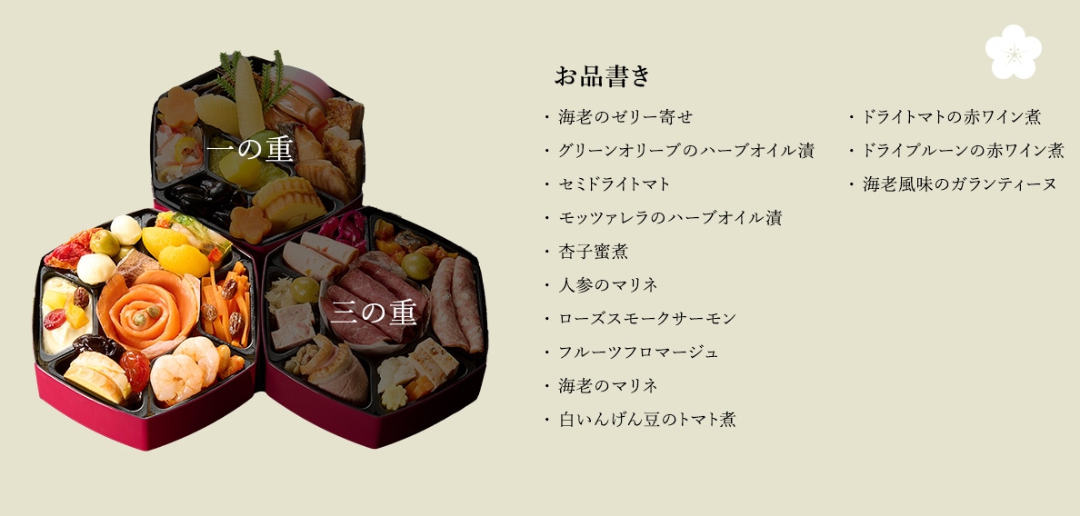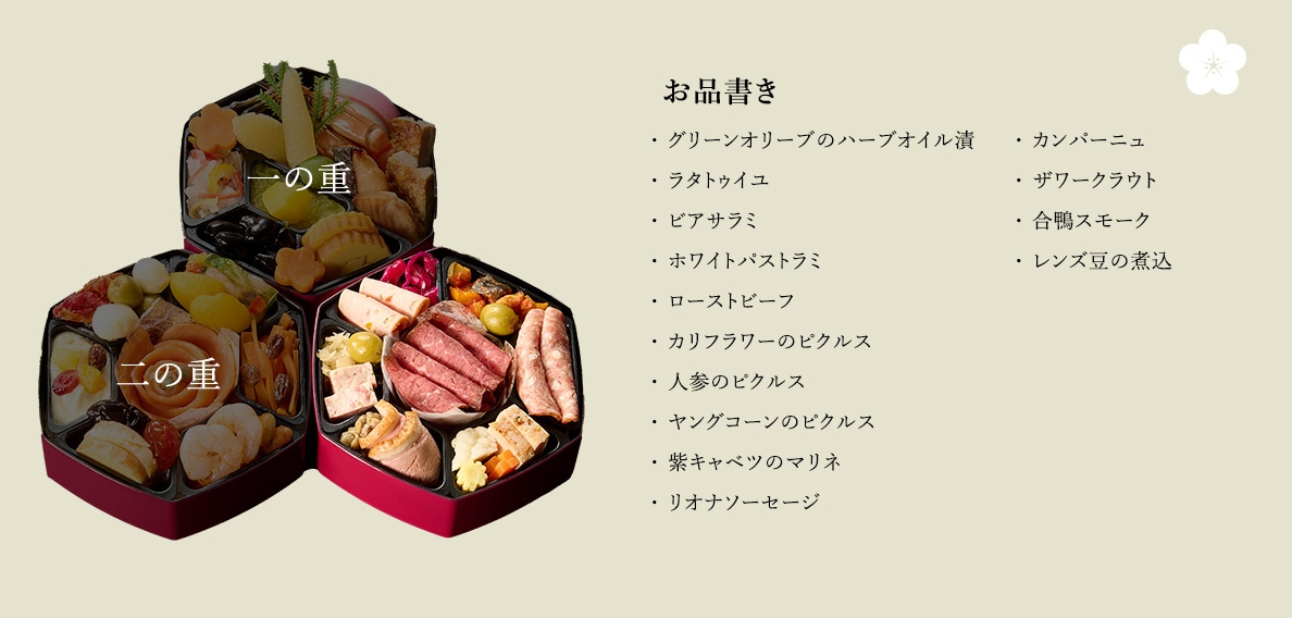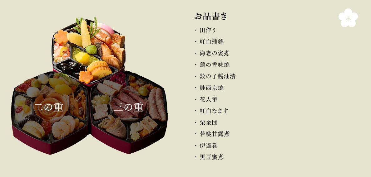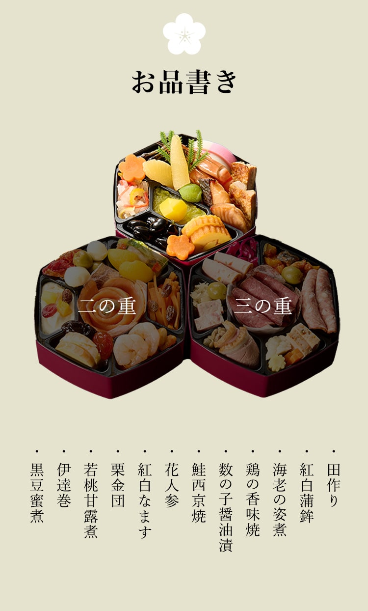 原材料 おせちと一緒にお届けするリーフレット(お品書き)に明記しています。原材料の詳細については、カスタマーサポートまでお問合せください。 |