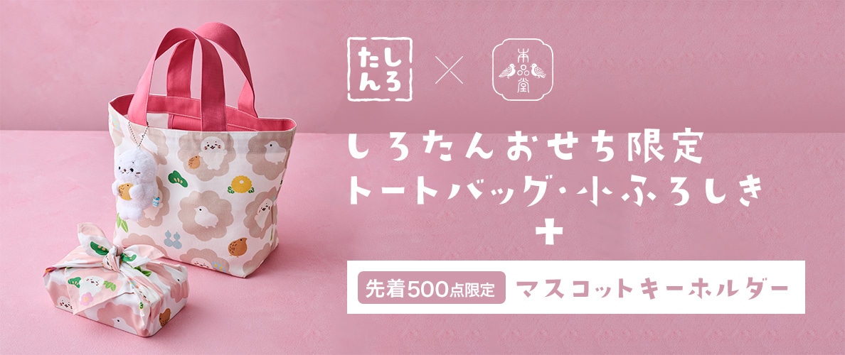 ご好評の限定ノベルティは、東京・浅草にある型染め工房「本品堂(ポンピン堂)」とコラボしたトートバッグと小風呂敷のセット。さらに、本品堂で人気のモチーフである「うずら」を抱っこした、ふわふわのしろたんマスコットキーホルダーを、先着500点限定で一緒にお届けします♪ しろたんの魅力満載のおせちで、ぜひ楽しいお正月をお迎えください!
