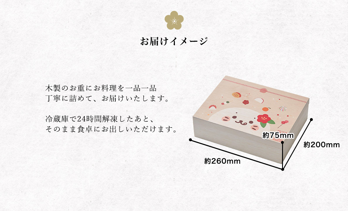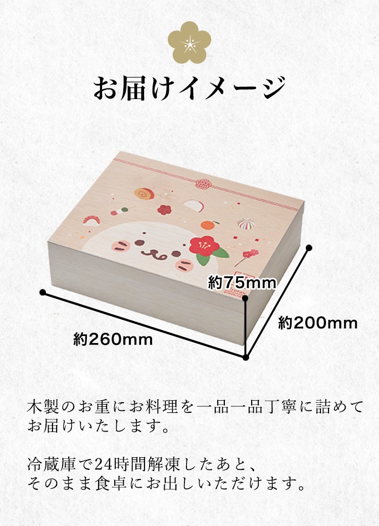 ※ 解凍後の料理の状態によっては、お重の底部分に漏れ出る可能性があります。