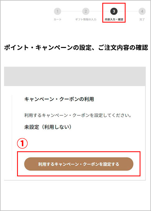 支払方法・注文内容確認ページの下部にある「キャンペーン・クーポン」の「利用するキャンペーン・クーポンを設定 」をクリックします。